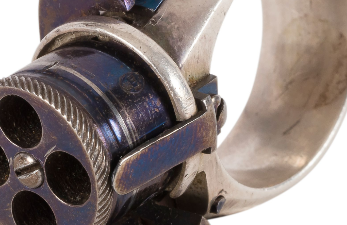 Silver-plated metal ring, engraved, with the blued hammer spring in the center.